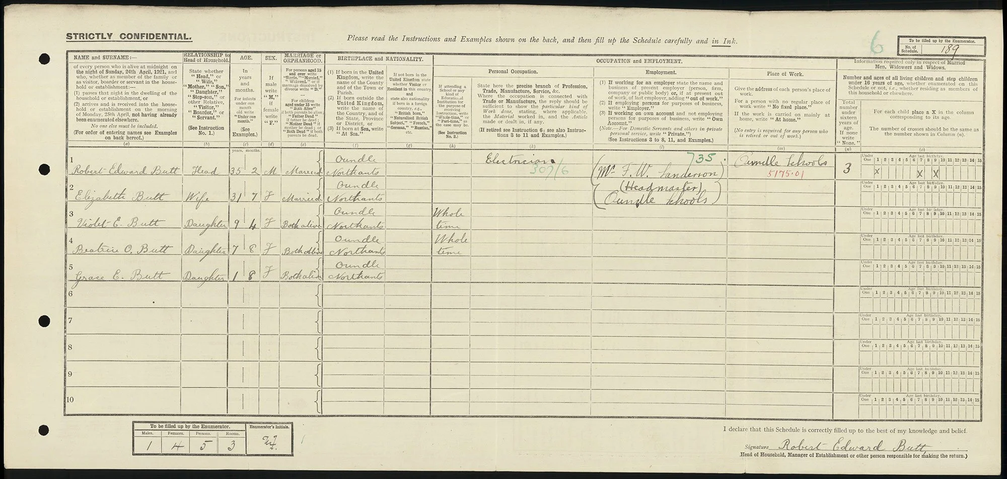 Robert was born on April 7th 1886 at Clark’s Yard, Oundle, Northamptonshire, UK. The youngest child of parents George William Butt (29 years old), an agricultural labourer, and his wife Charlotte Odam (36 years old), Robert had at least five siblings (Eliza Ann Odam, 1875-1959; Emily Rebecca Butt, 1876-1959; William James Butt, 1879-1964; John Thomas Butt, 1881- ; Mary Ann Elizabeth Butt, 1884-1953).