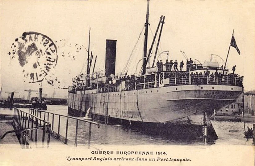 At 6:15 am the vessel makes its way across the English Channel to St Nazaire harbour on the west coast of France, carrying soldiers, horses, vehicles and bicycles to reinforce the British Expeditionary Force on the Aisne. The group catches a train to Coulommiers outside of Paris and marches onward to Chateau Thierry some 26 miles away on September 15th 1914, stopping for tea along the way. From there they march in heavy rain to Bourg via Tigny, Chaerise and Nampteuil, and arrived at 7:00 am on September 19th 1914. Within 5 hours, the village was being shelled. The battalion proceeded to Troyon, located on the southern slope of the Chemin des Dames ridge and north of the River Aisne, and after dark, relieved the Coldstream Guards in the firing line and support trenches.